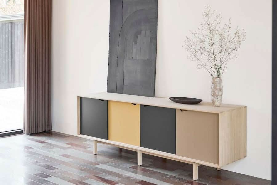 S1 skænken fra Andersen Furniture er en stilfuld skænk med et korpus i eg sæbe, og et flot sammenspil af de forskellige farver på fronterne.