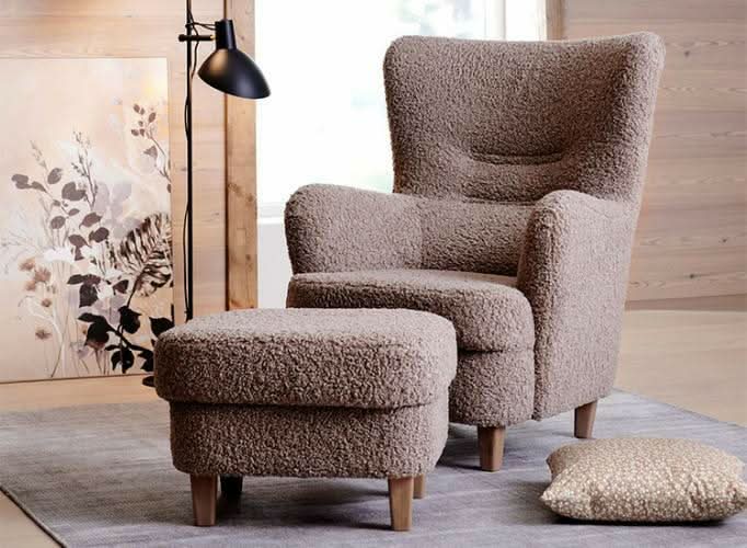 Buddy lænestol og skammel, er lavet i lækkert imiteret fåreskind i dessin Glore, som giver lænestolen et indbydende udtryk.