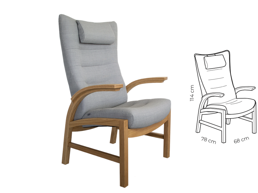 Lænestolen er lavet i en eg lak, og har monteret et slidstærkt Morph 4101 stof.