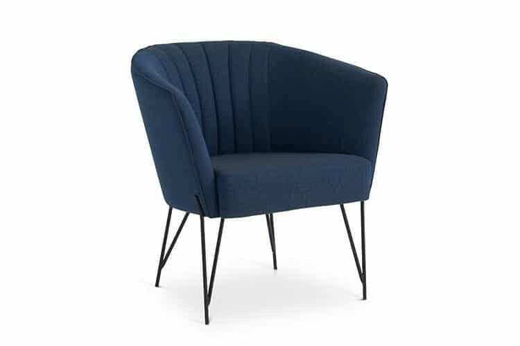 Cancun lænestol står her i et mørkeblåt stof i dessin Oakland