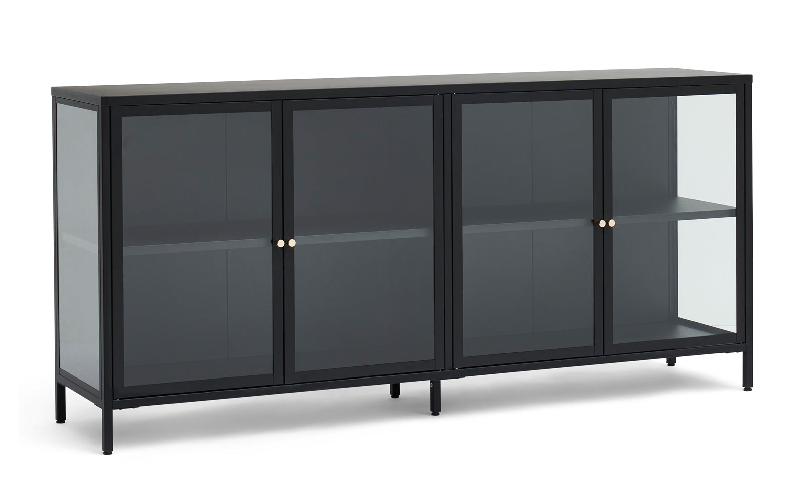 Como skænken har fire glaslåger og en lang hylde indeni, som giver dig masser af plads til opbevaring eller udstilling af pyntegenstande, bøger, kasser eller køkkengrej. Med en bredde på 170 cm, en dybde på 40 cm og en højde på 80 cm er denne skænk både rummelig og alsidig. Glassiderne tilføjer lys og luftighed til møblet, og det stilrene design i sort metal med glas gør Como skænken til en funktionel og æstetisk løsning i stuen, køkken-alrummet eller gangen.