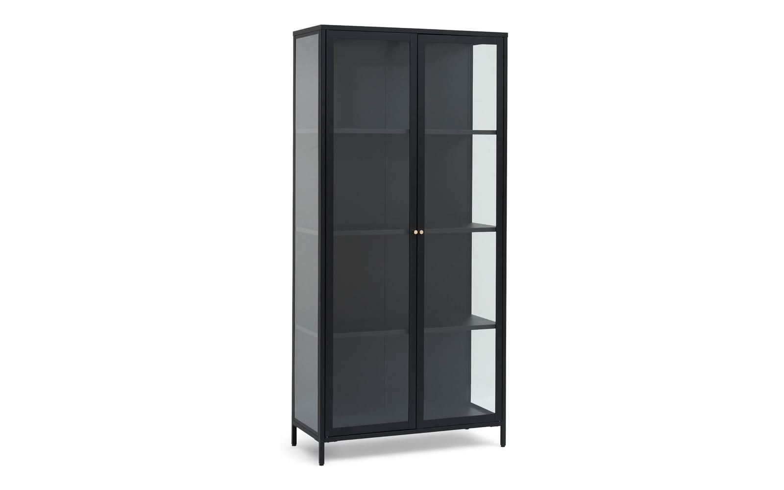 Leder du efter et stilfuldt opbevaringsmøbel til køkkenalrum eller stue? Como vitrineskab i sort metal med glaspaneler er den perfekte løsning til dig. Med en imponerende højde på 190 cm og en bredde på 90 cm tilbyder Como både rummelighed og æstetik. Vitrineskabet har to glaslåger med elegante messinggreb, som giver et sofistikeret udtryk, mens glassiderne sikrer et lyst og åbent design, der passer ind i ethvert moderne hjem.