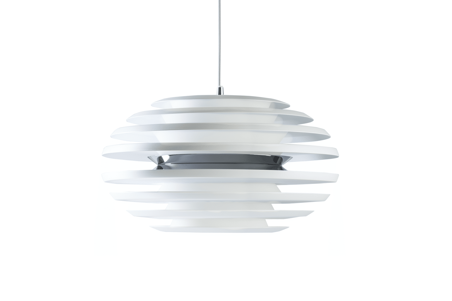 Lækker loftlampe fremstillet i hvid/krom fra svenske Belid. Den elliptiske form giver denne lampe et flot stilrent design med et interessant lys og en svævende fornemmelse.