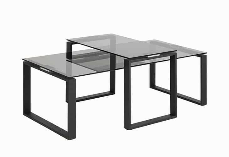Emily sofabordssæt er lavet i røgfarvet glas, og stellet er udformet i sortmalet metal.
