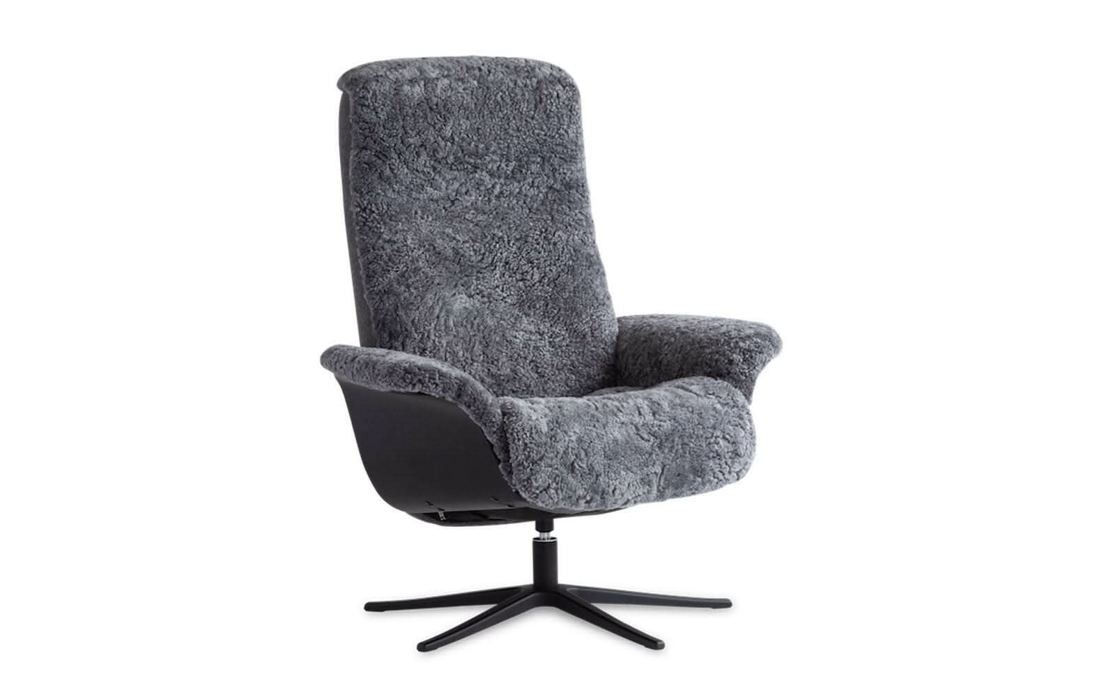 Galaxy lænestol og skammel ses her hvor stolen er betrukket med ægte fåreskind i dessin Sahara Grey, som er fantastisk rart at sidde i.