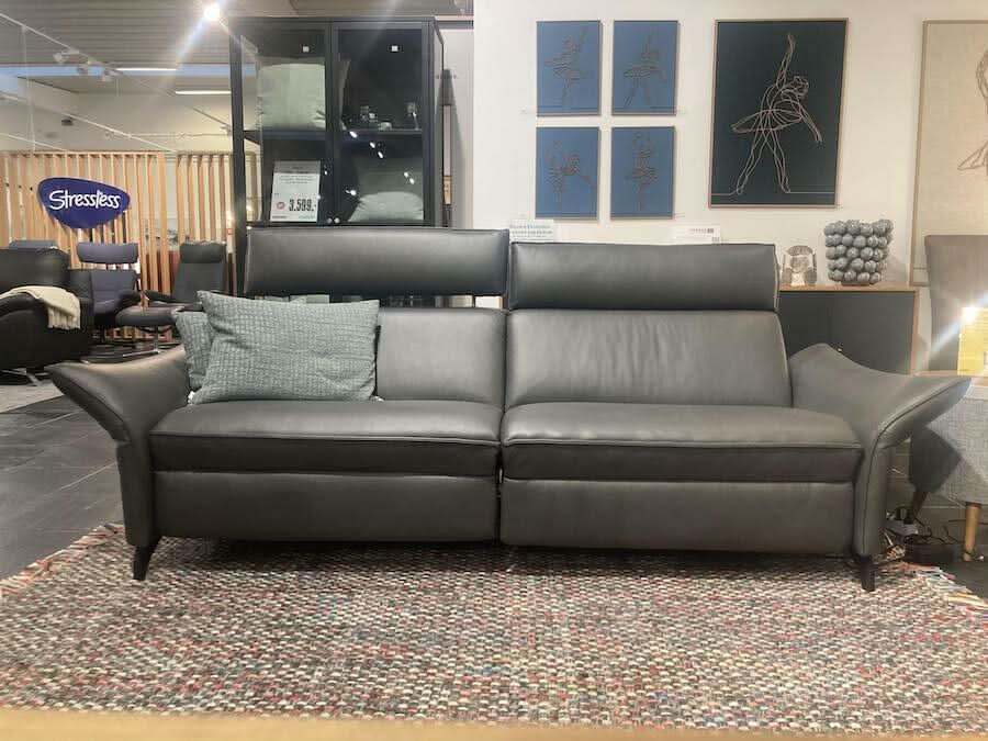 Sofaen er betrukket med en Napa Nero læder, hvilket er en antracit okselæder.