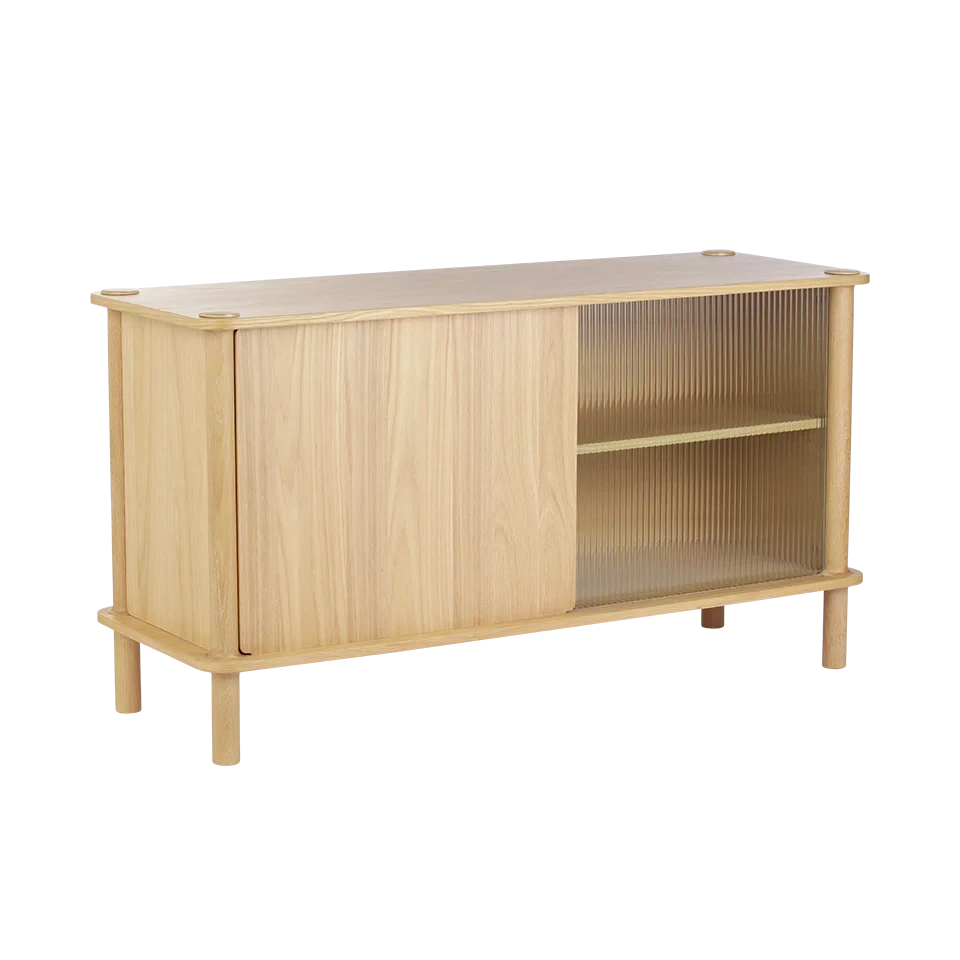 Vælg mellem døre i egetræ eller riflet glas for at tilpasse og forbedre dit indre rum efter dine præferencer. Dørene kan kombineres på forskellige måder for at skabe et udtryk, der harmonerer med resten af din indretning. Trædørene har to forskellige sider: En side med diagonale årer og en side, hvor årerne løber lodret.