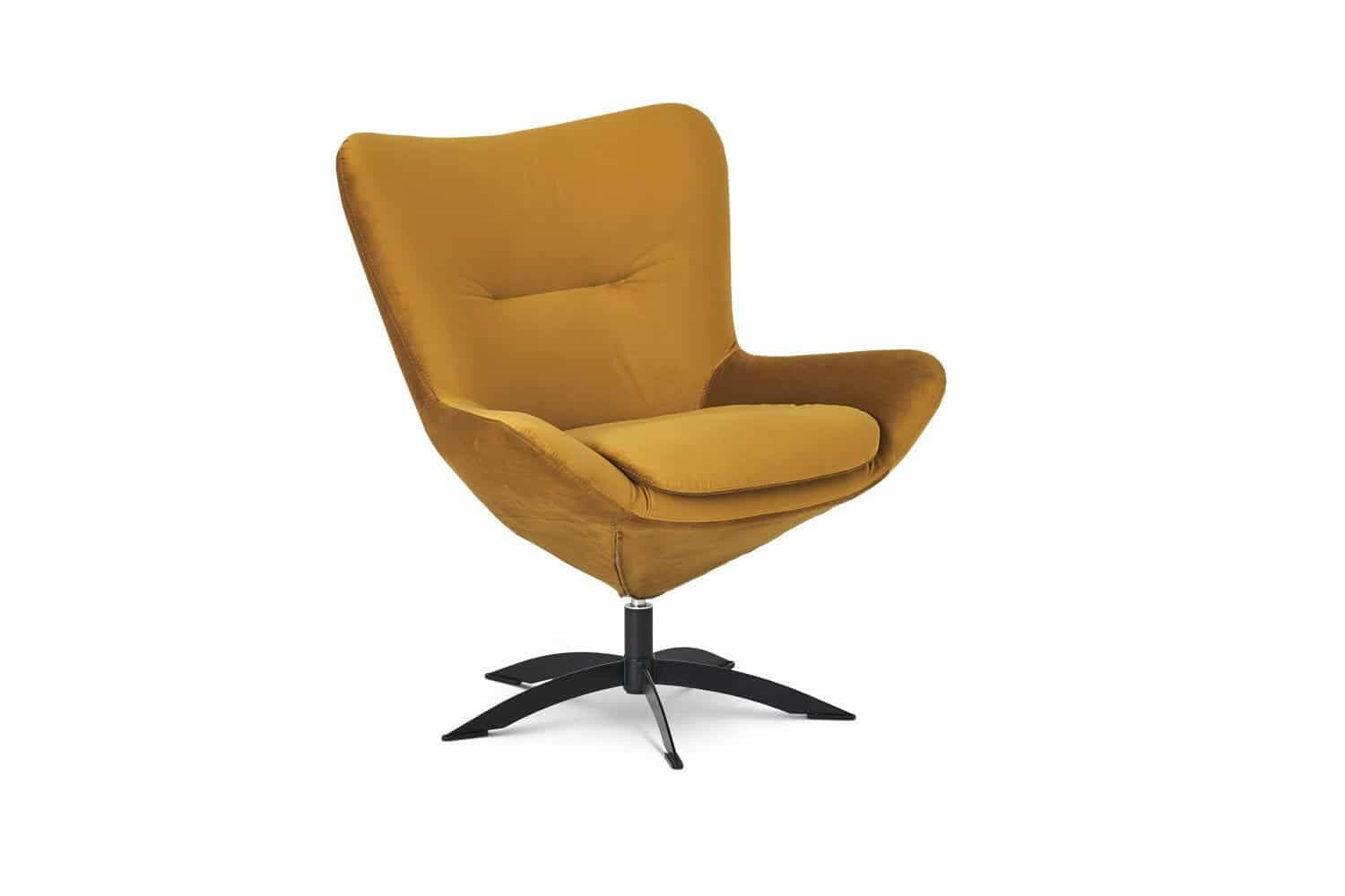 Lotus drejestol er en stilfuld og elegant lænestol med et slankt sort stel, der vil passe ind i mange forskellige hjem. Her ses stolen i en smuk gul Mirage velour, men den kan også laves i fem andre flotte velourfarver.