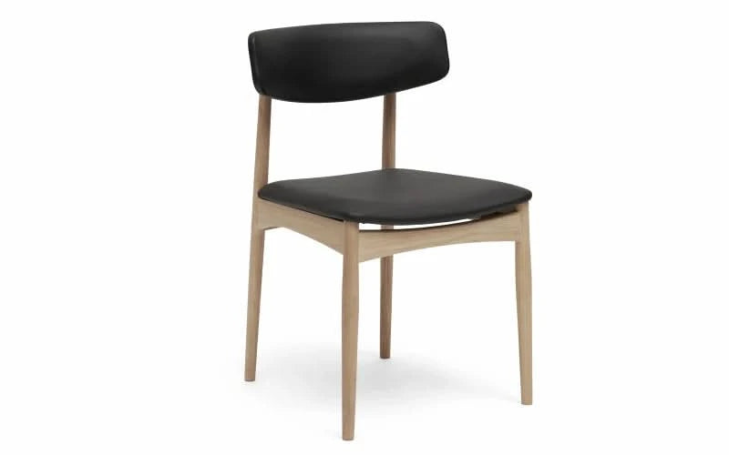 Lyø er fremstillet af i hvidolieret eg og i en mørk sort læder. Den hvidolierede stol passer perfekt til hjem med lyse spiseborde, hvad enten de er lavet af hvid laminat eller lysere træ. Sæde og ryg er betrukket med et slidstærkt læder, der sikrer langvarig brug.