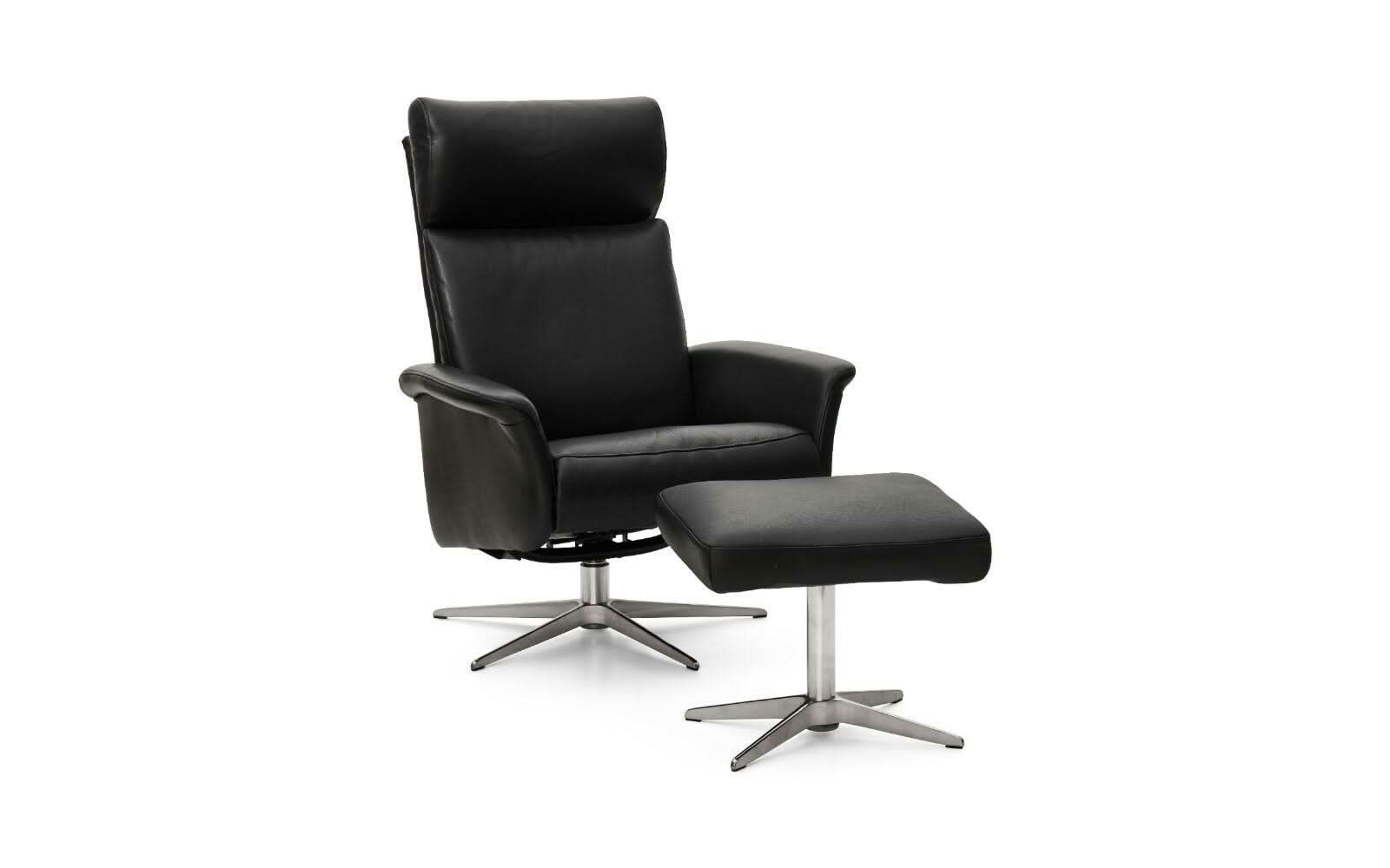 Milton lænestol og skammel er lavet med pæne runde former med et stel lavet i metal.