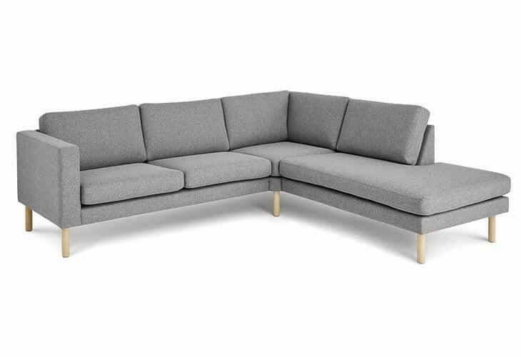 Hjørnesofaen ses her med lysegråt stof i dessin 361, og med flotte runde ben i egetræ.