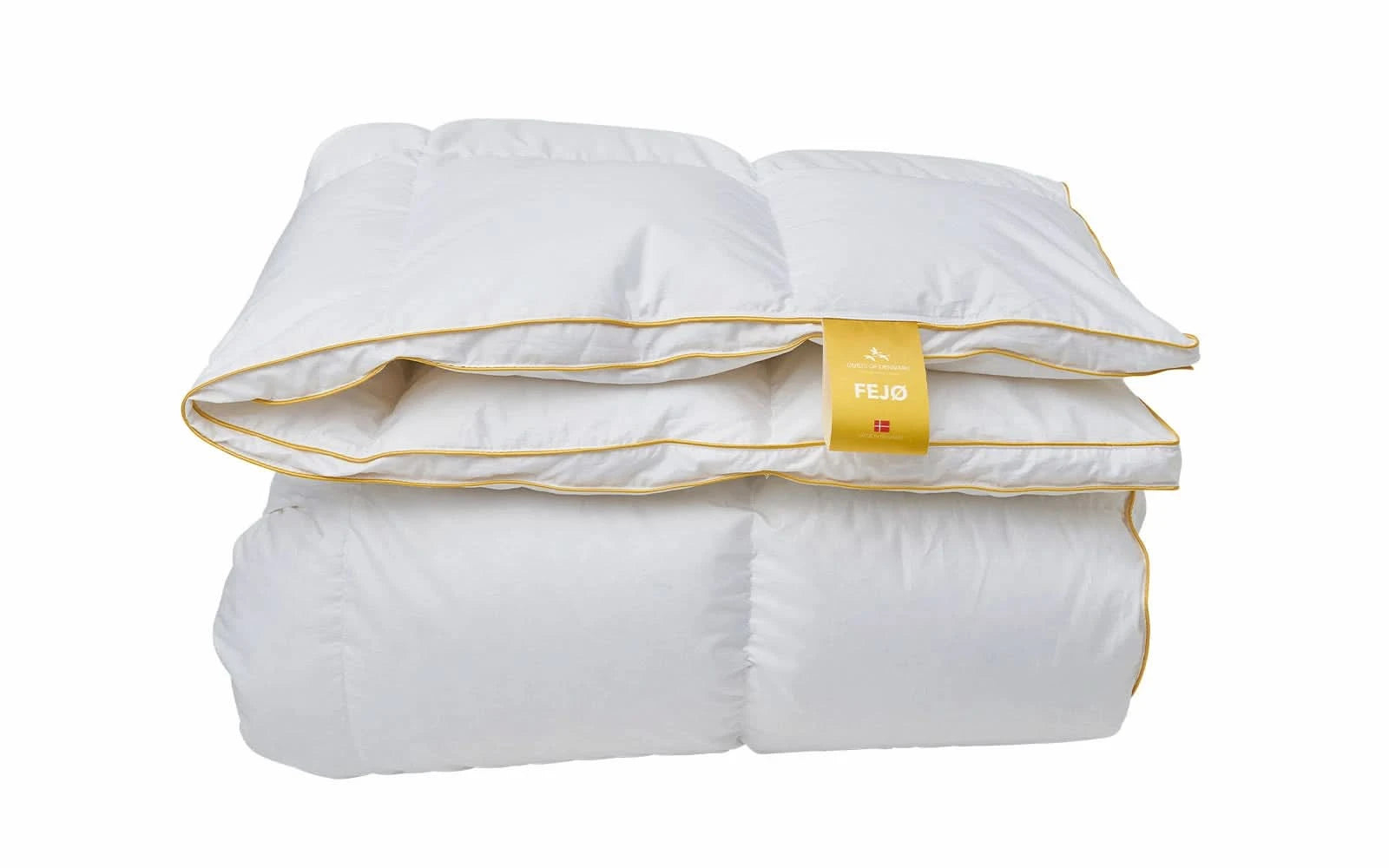 FEJØ er en eksklusiv kollektion af dyner og puder, håndlavet i Danmark. Serien er fremstillet af det fineste satinvævede bomuld og fyldt med luksuriøse moskusdun.