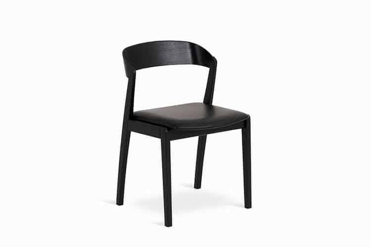 Spisebordsstolen ses her i en sortbejdset eg, og med et betræk af læder, som er praktisk, da det ikke suger, og er let at vedligeholde.