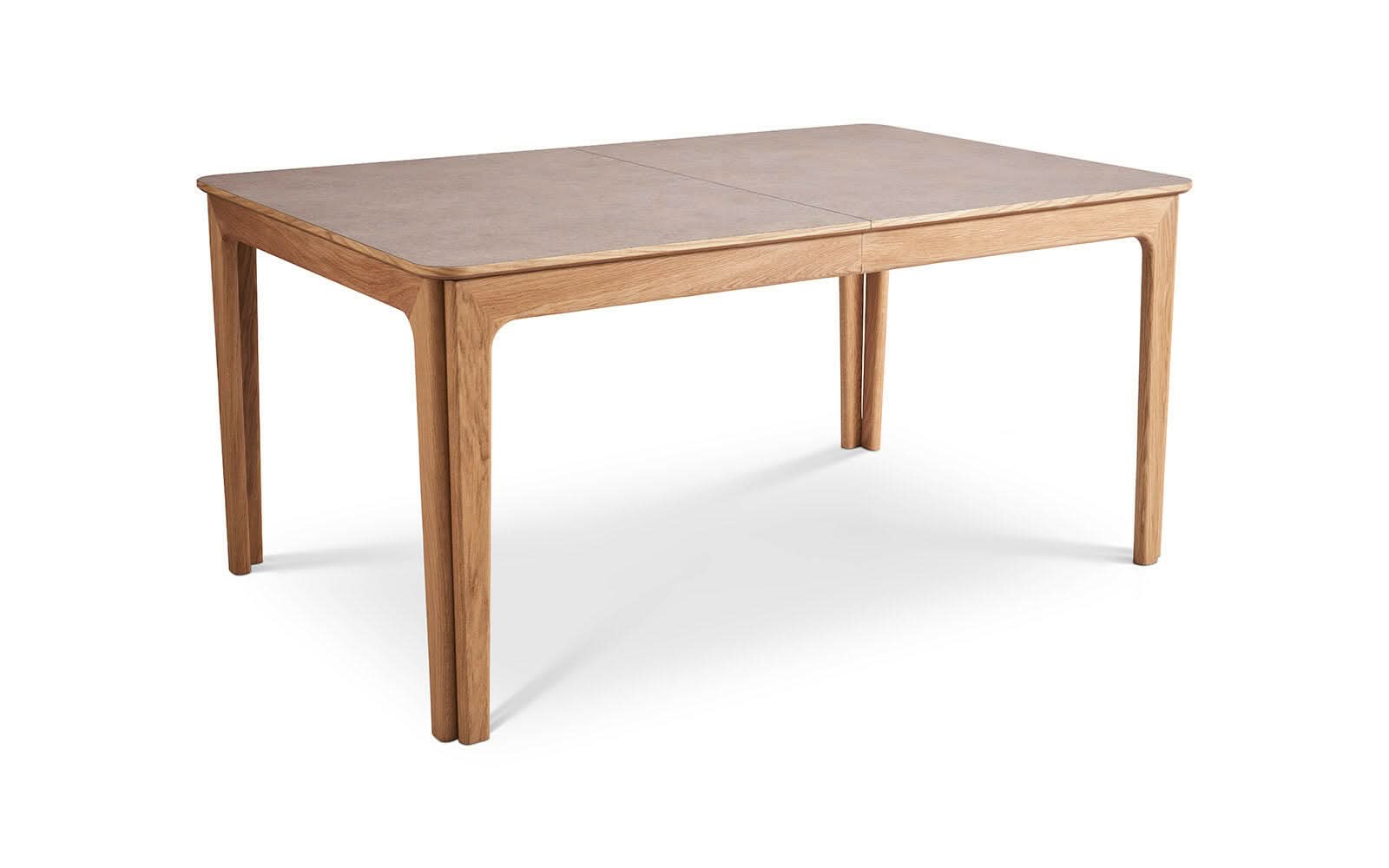 SM26 fra danske Skovby står her i en naturolieret eg, og en bordplade med en pæn lys stonelaminat, som har samme praktiske funktion som en højtrykslaminat.