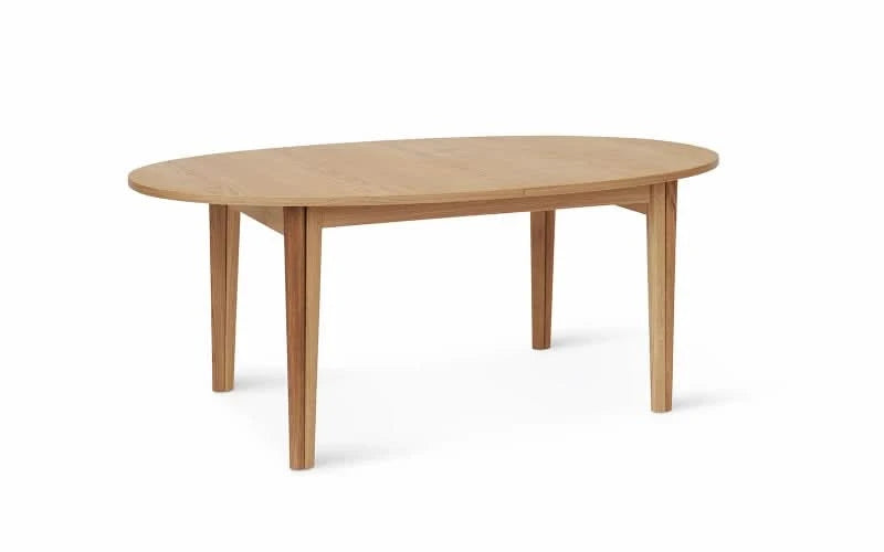 Bordpladen har en elegant ellipseform, mens bordbenene er udformet som halve ellipser, hvilket tilføjer et moderne og unikt twist til designet. Benenes skrå vinkel tilføjer ikke kun til æstetikken, men har også praktisk betydning. Bordet er lavet af finér eg med en naturlig olielak finish.