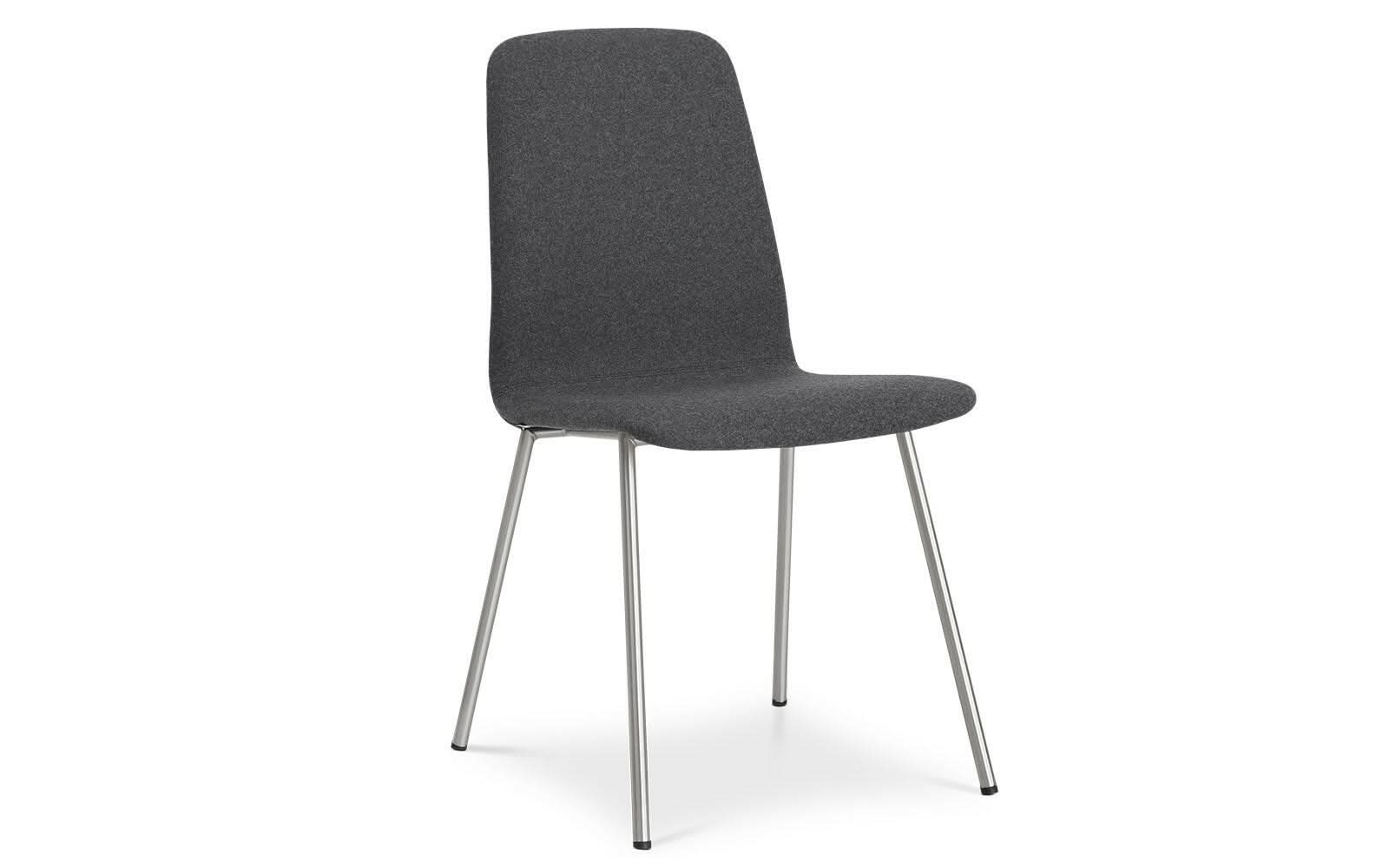 Spisebordsstolen er monteret med et elegant stel i stål og så er den betrukket med gråt stof i dessin Touche.