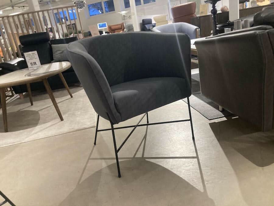 Sofia armstol er lavet i gråt stof, og har sort metal understel.