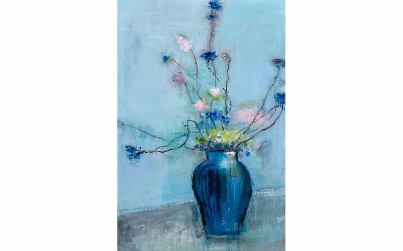 Elegant og delikat værk af kunstneren Ellen Munk. Målene for dette billede er 80 x 120 cm, og det portrætterer en smuk buket blomster i en vase, domineret af dejlige blå toner med strejf af rosa og en anelse gult.