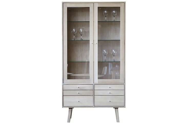 Square er nogle af de få som leverer lækre opbevaringsmøbler i massiv træ. Vitrinen ses her i en hvidolieret egetræ med 2 låger og 3 hylder i glas samt 6 skuffer.