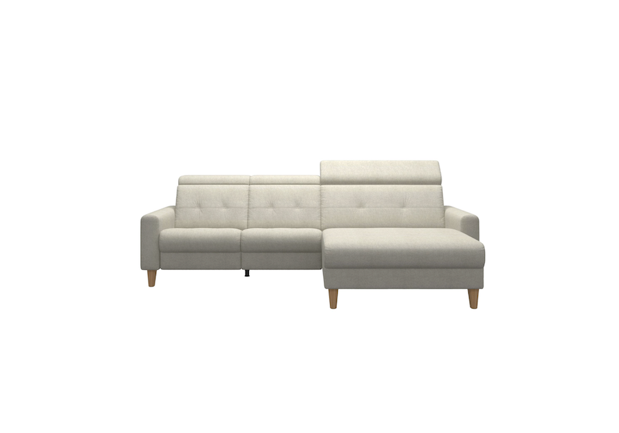 Stressless® Anna er en elegant sofa i Clover light beige stof med mulighed for motoriserede funktioner i hvert sæde. Du kan vælge mellem sæder med manuel justering af nakkestøtten eller motoriserede sæder, der løbende ændrer vinklen på nakkestøtten, ryglænet og den integrerede fodstøtte.