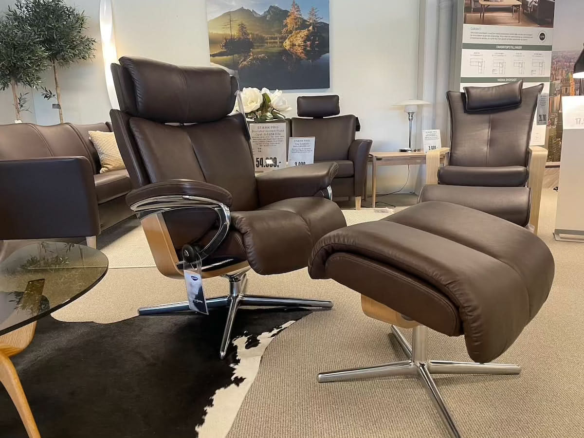 Stressless Magic lænestol og skammel er her lavet i størrelse small, og er betrukket i den bløde Paloma læder i farven 34 Chokolade.