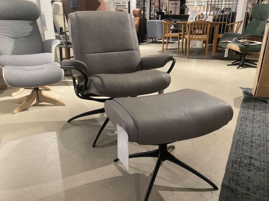Paris lænestol og skammel fra Stressless er her i en blød Paloma læder i farven Silver Grey.