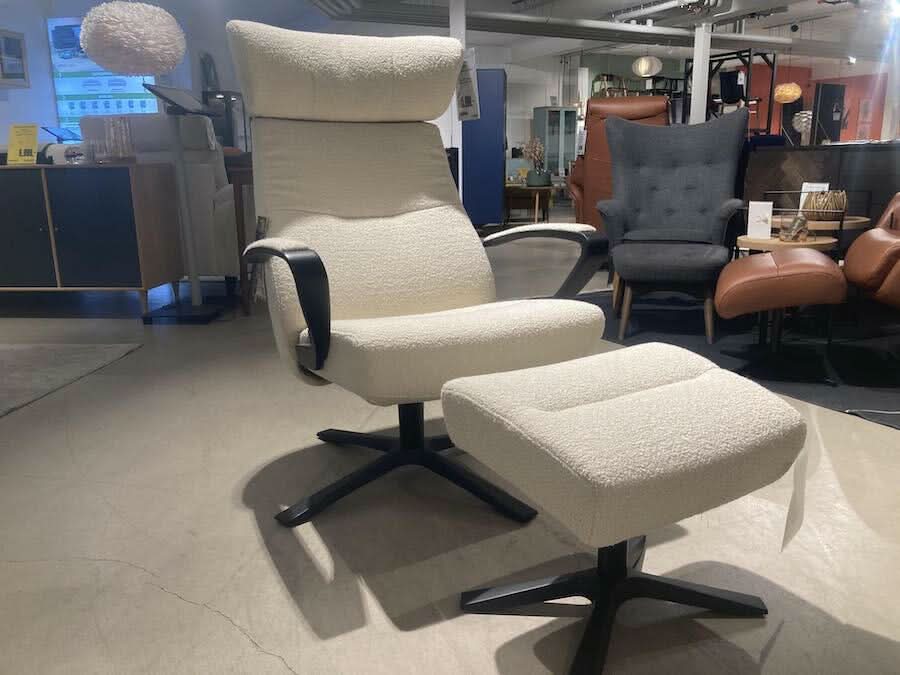 Style lænestol og skammel fra svenske Conform ses her i lyst Giani stof.