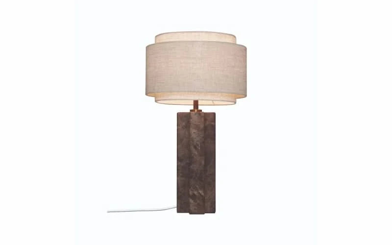 Den solide marmorbase fremviser en fascinerende form i varme brune nuancer, og kombinationen med den lette stofskærm i en smuk beige farve fuldender udseendet. Samspillet mellem marmor, hør og bruneret messing skaber en blød og varm æstetik, der inviterer til hygge og god stemning i enhver bolig.