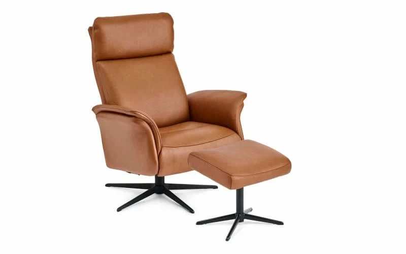 Teramo lænestol og fodskammel i cognacfarvet semianilinlæder kombinerer tidløst design med førsteklasses komfort. Lænestolen er udstyret med manuel regulering af ryggen, så du nemt kan tilpasse din siddeposition.