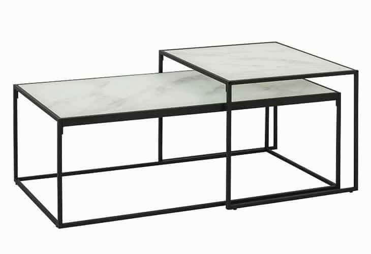 Sofabordssættet har en overflade lavet af glas, som har fået en marmor print – hvilket giver sættet et marmor udtryk.