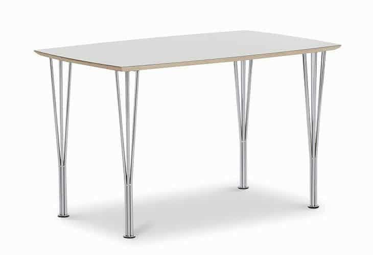 Spisebordet fra U-design står her i en hvid højtrykslaminat, og flotte enkle ben i chroome metal.