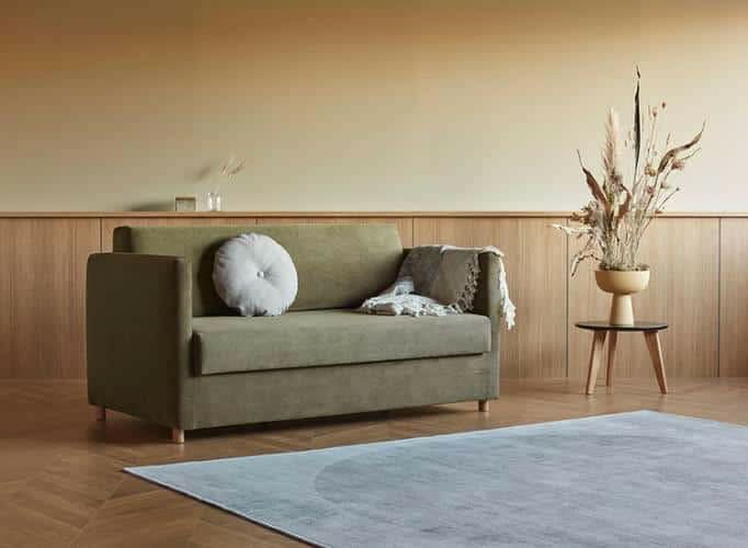 Vali sovesofa er en smal sovesofa, hvor du ikke bruge for meget plads på en stor bred arm. Vali er med nozagfjedre i bundet, og så er den polstret med koldskum. Derudover finder du et magasin til opbevaring, så vi alt i alt har en lille sovesofa som stadig er praktisk.