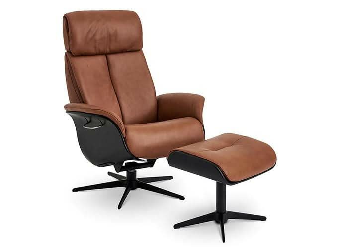 Ventura lænestole og fodskammel er høj på komfort, og så er det enkelt og elegant. Lænestol og skammel er betrukket med cognacfarvet semianilinlæder, som er en lækker blød læder, som har fået en lille overfladebehandling. Selve armene er i sort bøg, og dertil har man lavet soklen med sort metal stel.