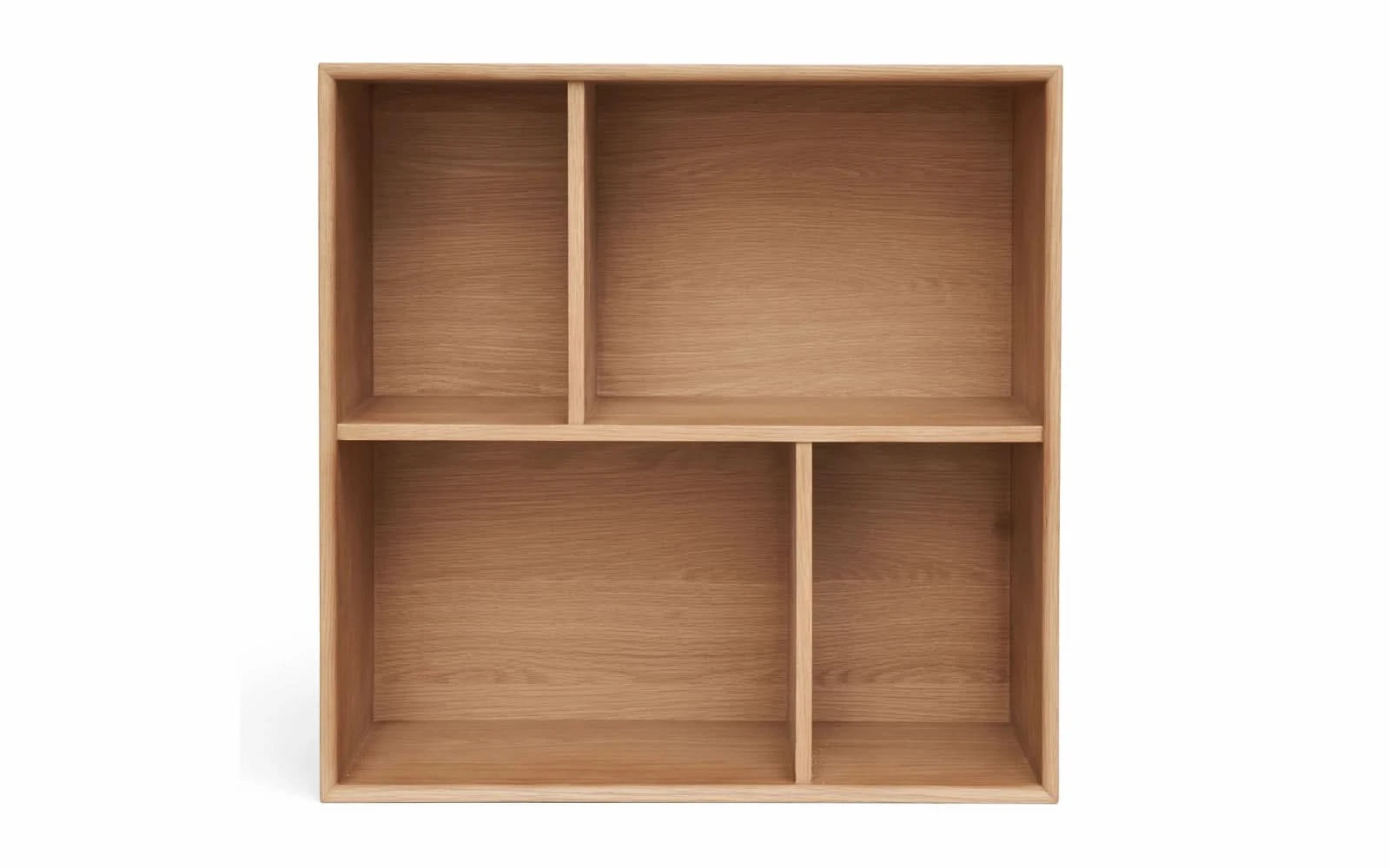 Bogkassen består af fire asymmetriske rum i varm egefiner, behandlet med naturolie og med afrundede og smigskårne kanter for en sofistikeret finish. Indersiden er glat og fri for forborede huller, hvilket giver dig mulighed for fuld fleksibilitet til at tilpasse rummet efter dine behov. Medfølgende sorte plastikben og ophængsliste giver dig mulighed for at montere kassen på væggen eller skabe et svævende udseende efter eget ønske.